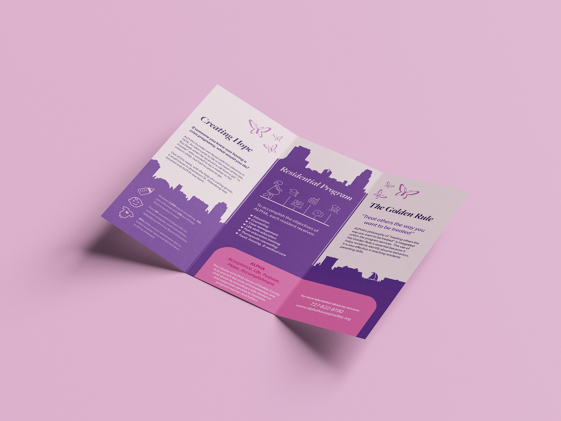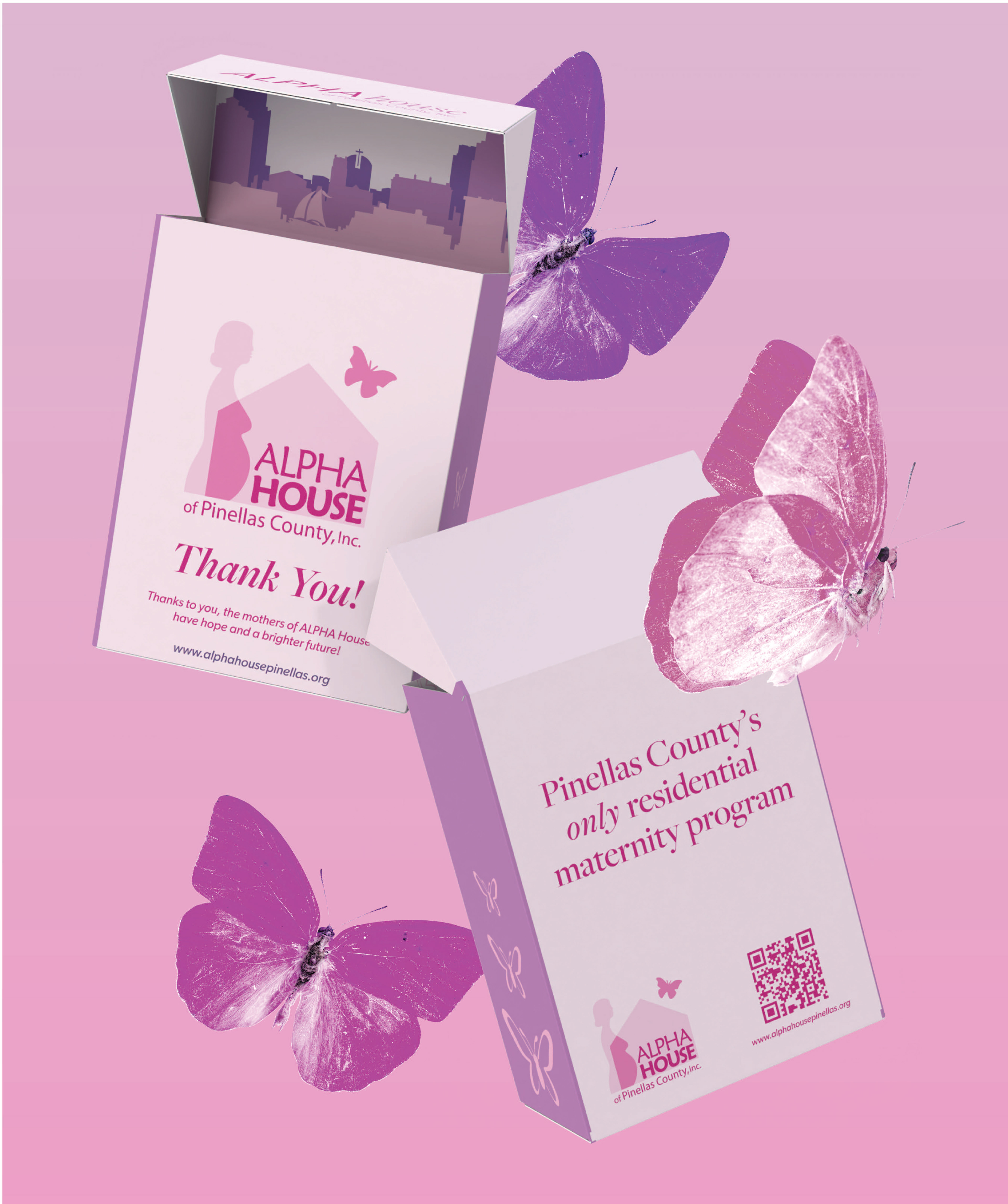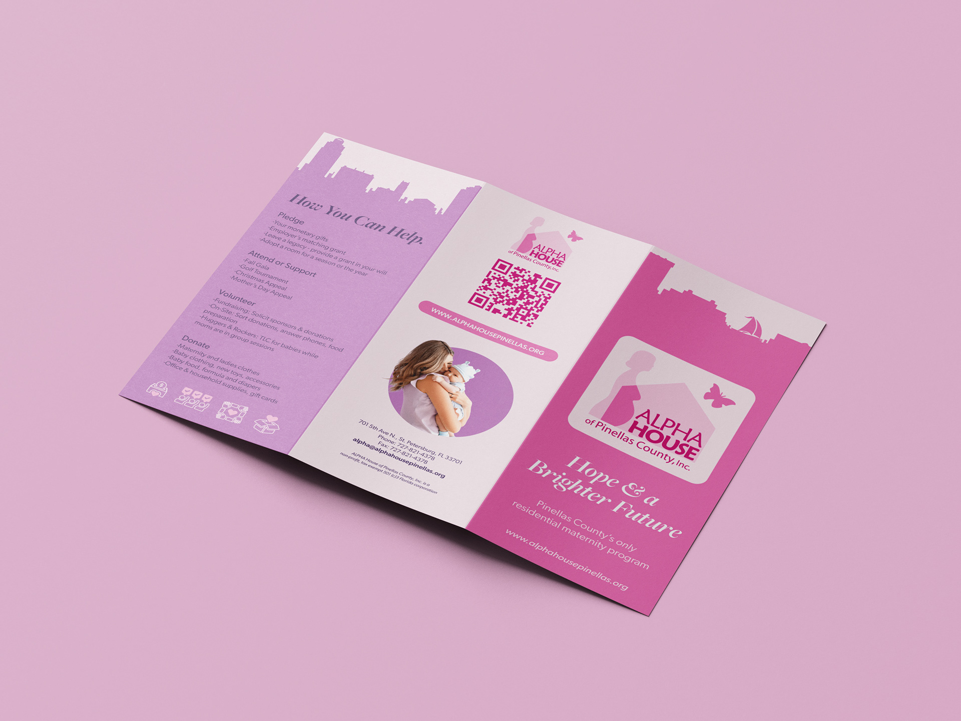 Group project incorporating client’s existing branding. My main contribution was editing content to enhance readability and creating packaging for donor thank-you gifts. Currently in use by ALPHA House of Pinellas County.