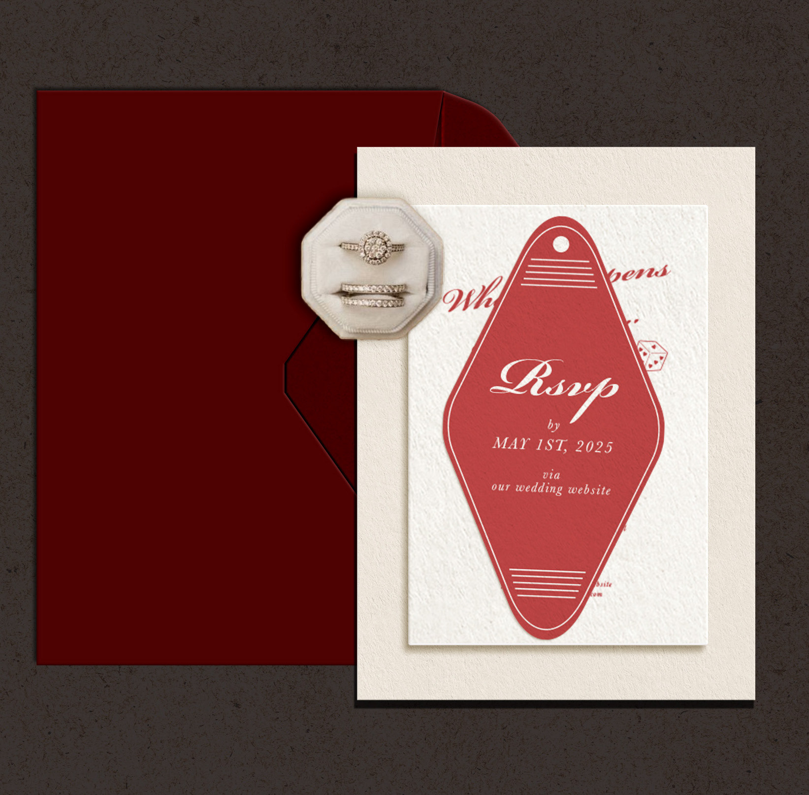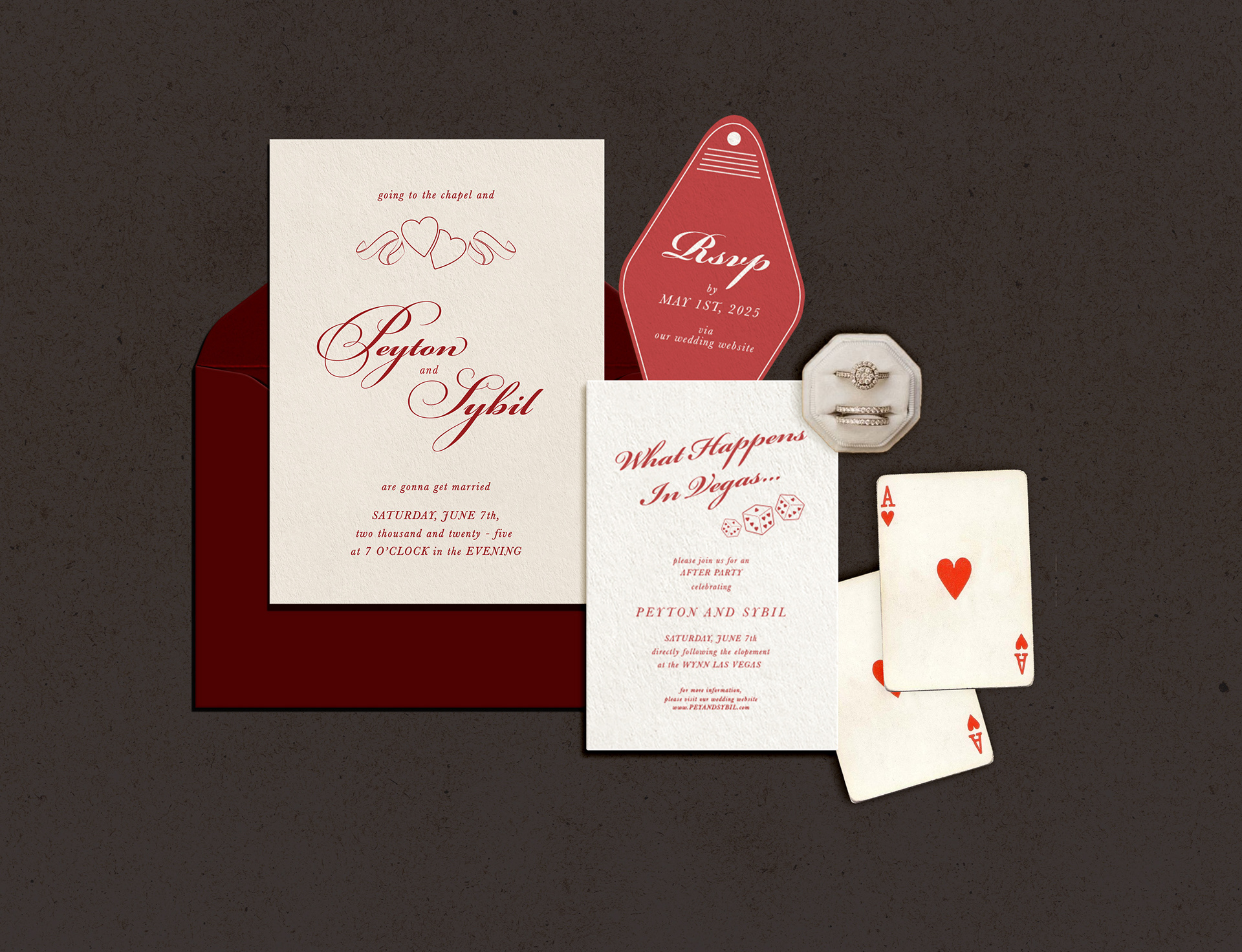 Concept for letterpressed invitation suite for a Vegas elopement. Includes a custom die-cut RSVP and themed illustrations.